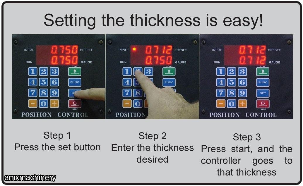The thickness setting for the work can be set by the use of our dual display digital thickness controller. This is the easiest means of operation for setting your work piece thickness. If you desire a setting of ¾” you simply enter into the controller .750 and the table will automatically go to the setting you entered.